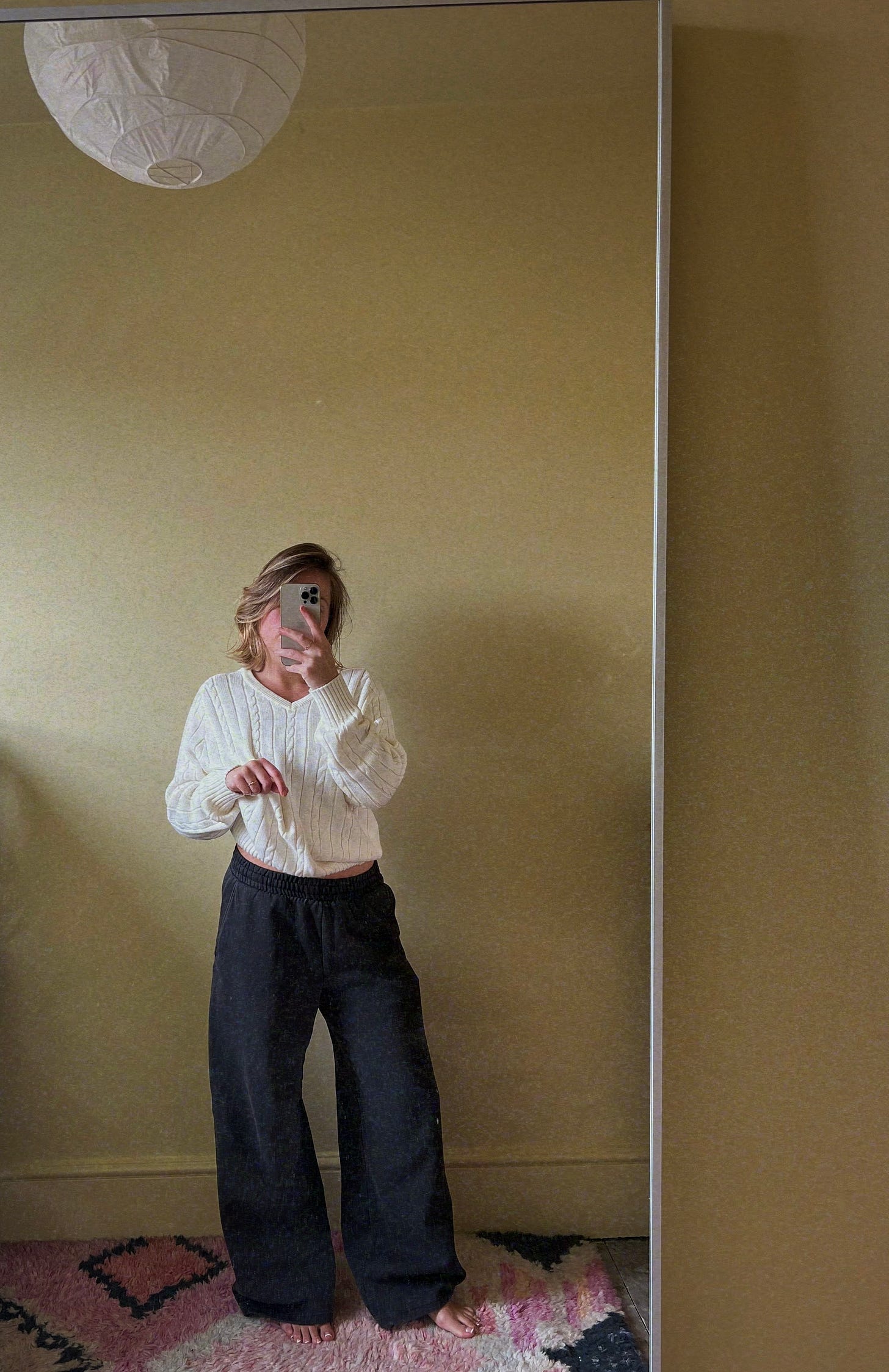 I recently bought these Weekday tracksuit bottoms, so comfy! But if you don’t want to buy some you can always cut the ends of your old tracksuits to make them flared :)