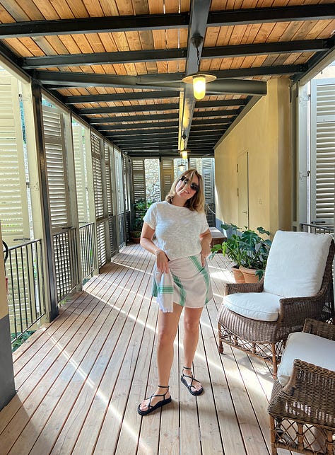 Sarong: Arket Beach blankets also work so well as sarongs, I bought my yellow one 2 years ago and take it on every holiday as you can use it as a towel at the beach. They have brought it out in green and white. Link here.